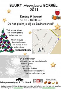 9 januari 2011, nieuwjaarsborrel Zeeheldenbuurt 23/12/2010 lid bv TU Noord Buurtaktiviteiten Saamhorigheid in de wijk: de buurTvrouwen organiseren op 9 januari vanaf 16.00 uur, buitenbuurten met ruilballenboom. Locatie: hoek Cornelis en Maerten Trompstraat