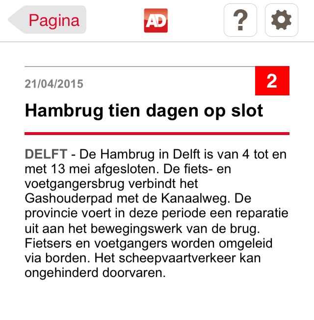 Hambrug gesloten van 4 t/m 13 mei 21/04/2015 lid bv TU Noord Verkeer Vandaag in het AD: De Hambrug in Delft is van 4 tot en met 13 mei afgesloten.