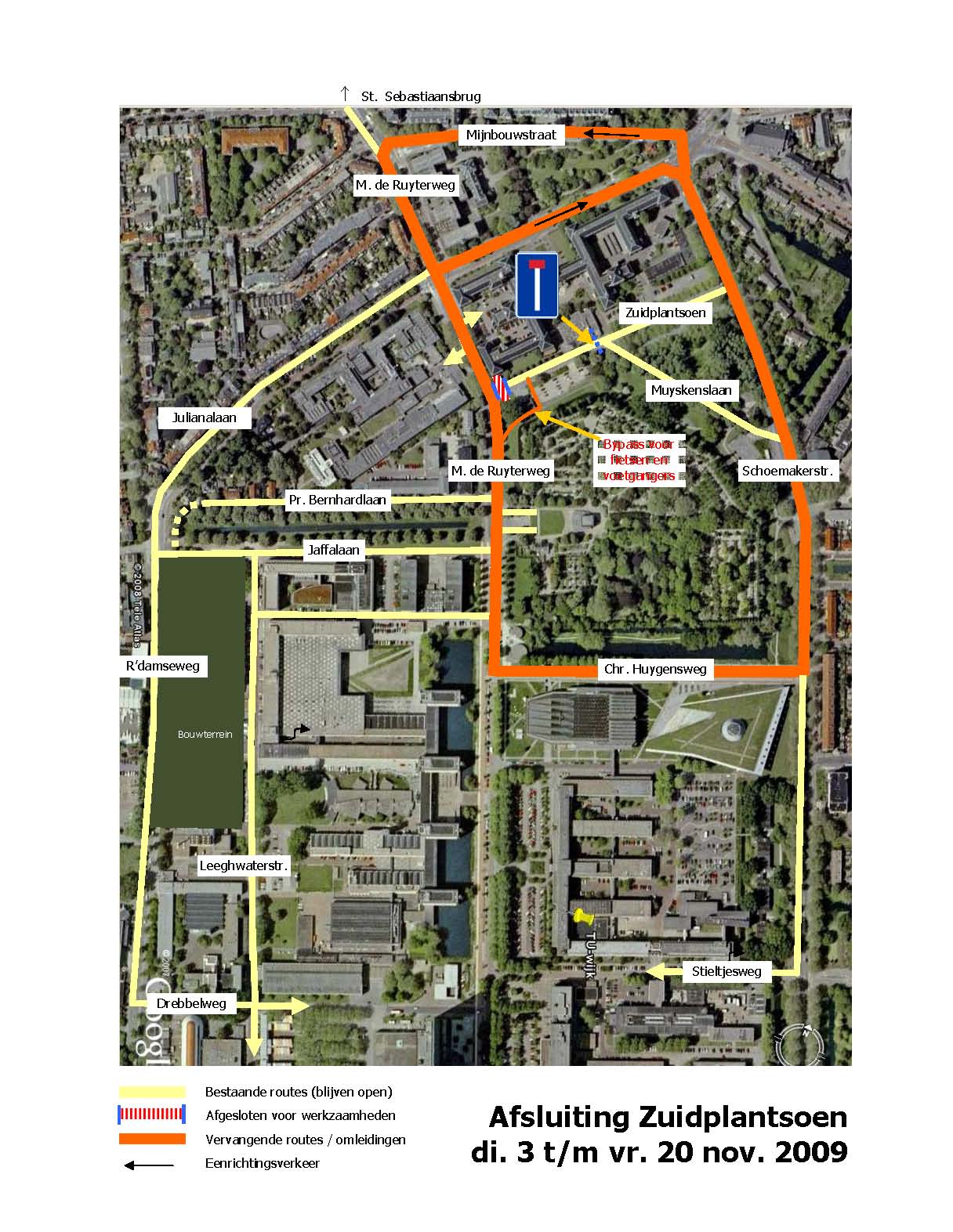 Van de TU Delft ontvingen wij het bericht dat het stuk Zuidplantsoen nabij de Michiel de Ruyterweg afgesloten wordt voor het verkeer van 3 november tot uiterlijk 20 november. Zie de afbeelding voor de omleiding.