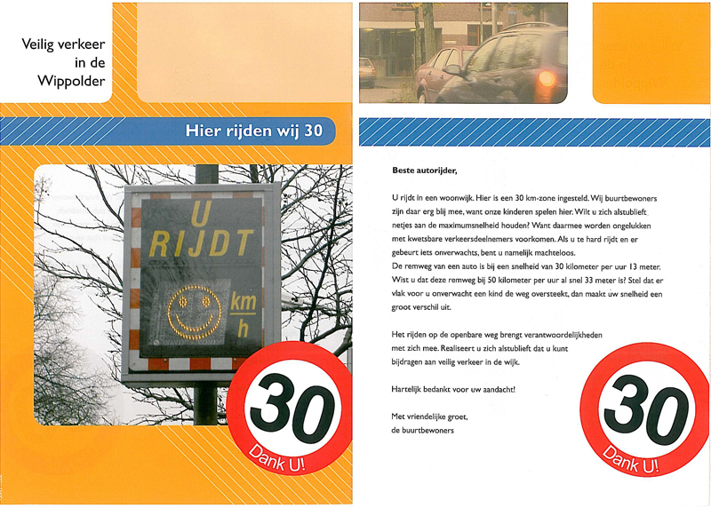 Buurtbewoners hebben een pamflet verspreid in de wijk waarin opgeroepen wordt zich aan de maximum snelheid van 30km/uur te houden. Aangezien de folder huis-aan-huis verspreid is, lijkt het vooral een oproep aan automobilisten uit de buurt. Wie de flyers gemaakt en verspreid heeft, is ons niet bekend.